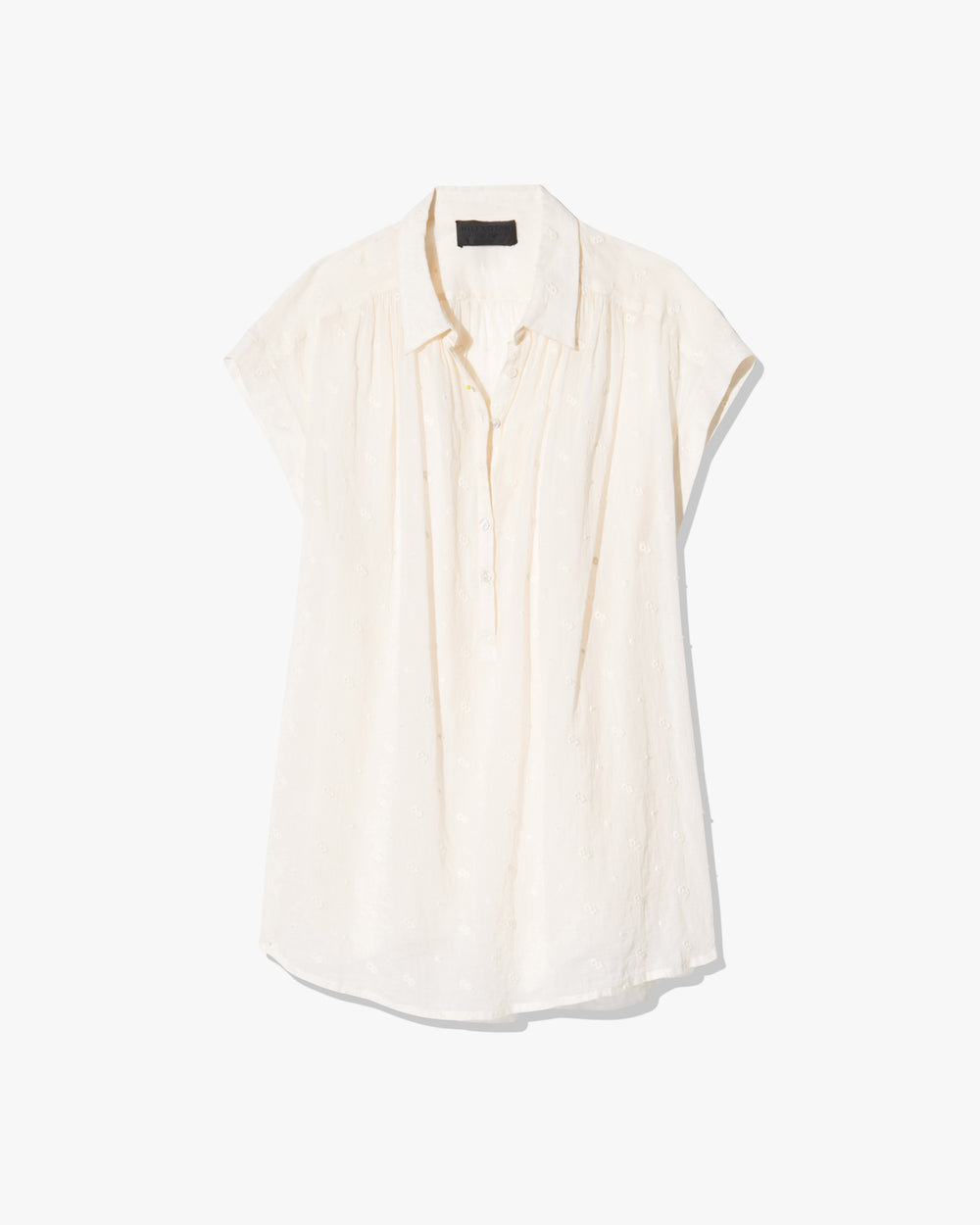 Oversized, voluminous pullover blouse. Dropped shoulder. Center front half button down with troka buttons. Shirring throughout front and back. Small collar. Shirttail hem. Hanger loop detail at back. Easily able to tuck in.