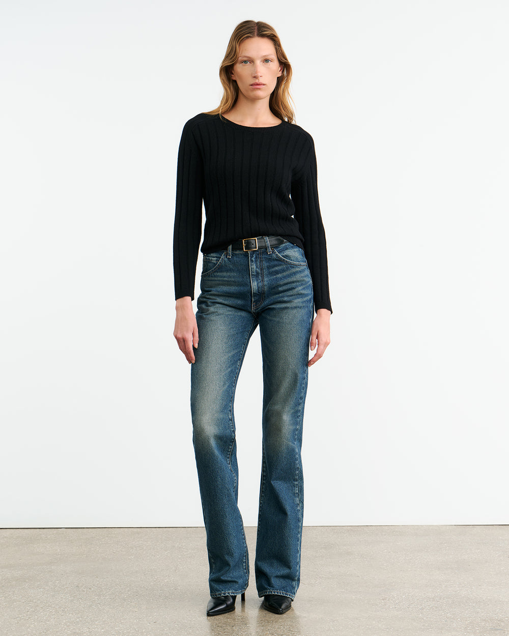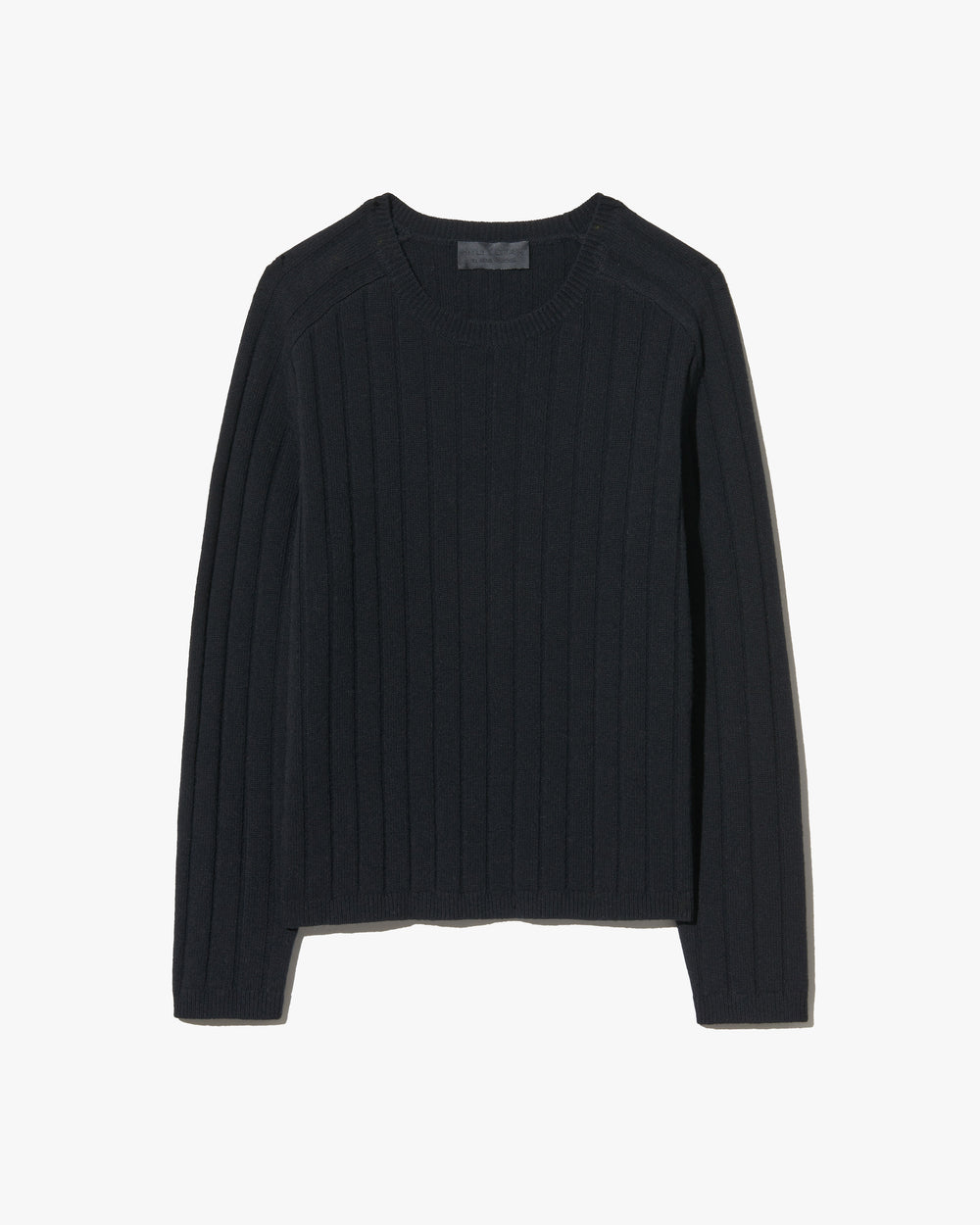Fine to medium weight relaxed wide rib knit sweater. Open neckline. Saddle shoulder. Fashioning details along arm hole. Rib trim at hem and sleeve. Normal length.