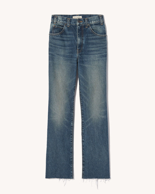 High-rise slim straight cropped jean in Japanese non-stretch crosshatch denim. Fitted through waist and hips. Five pocket details. Zip fly. Shank closure. Belt loops. Raw hem.