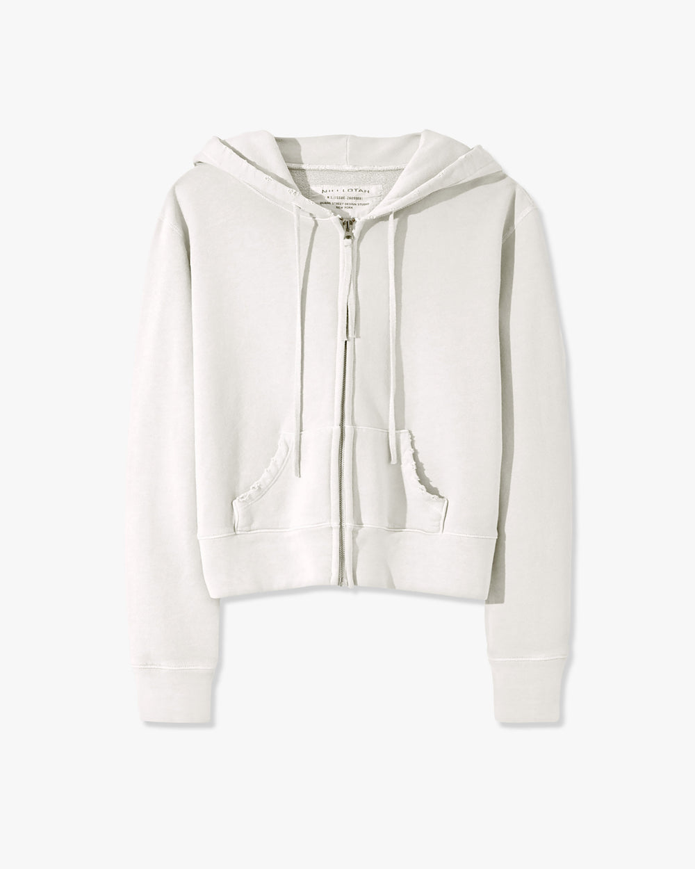 Slightly shrunken regular fit sweatshirt hoodie in American cotton. Distressing details. Patch pockets. Center front long draw cord at zipper.