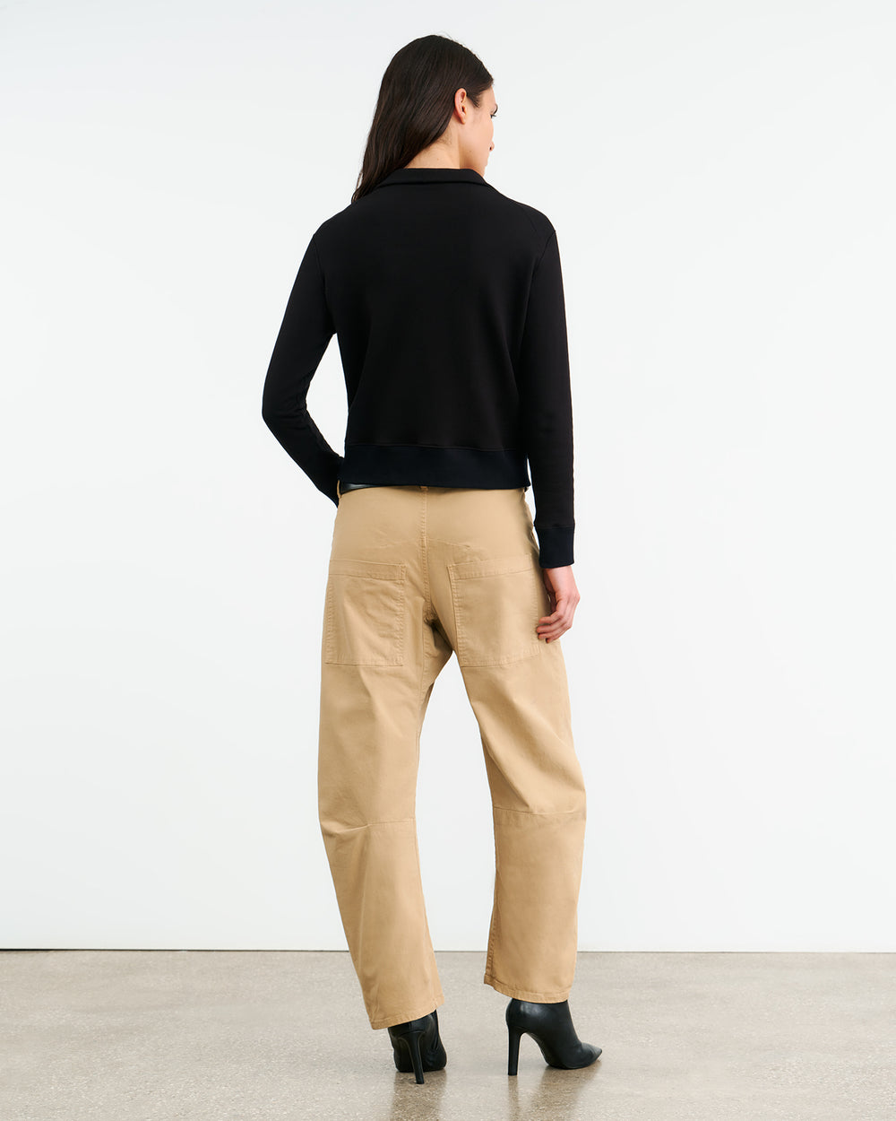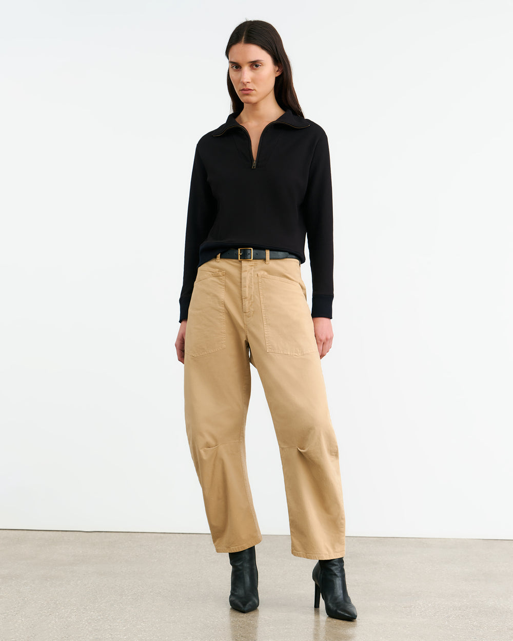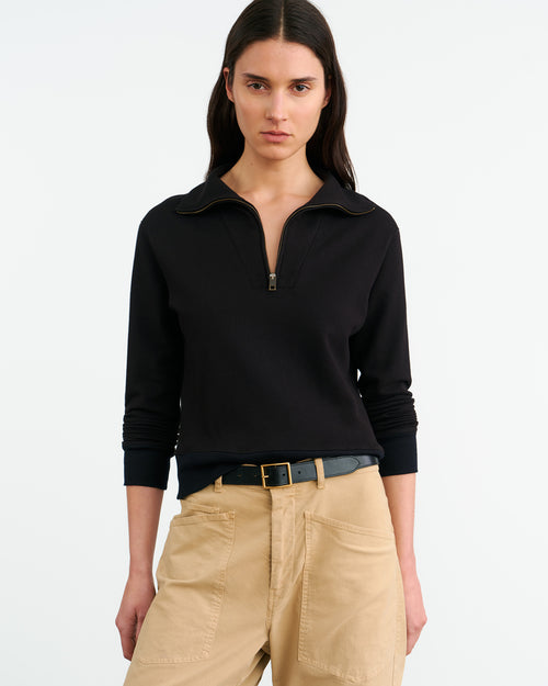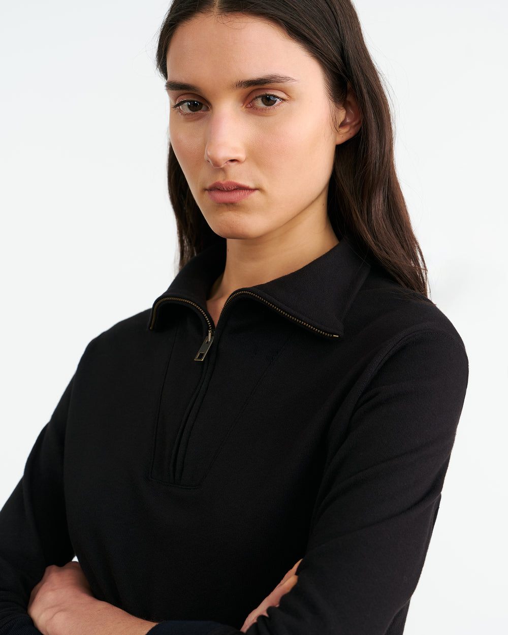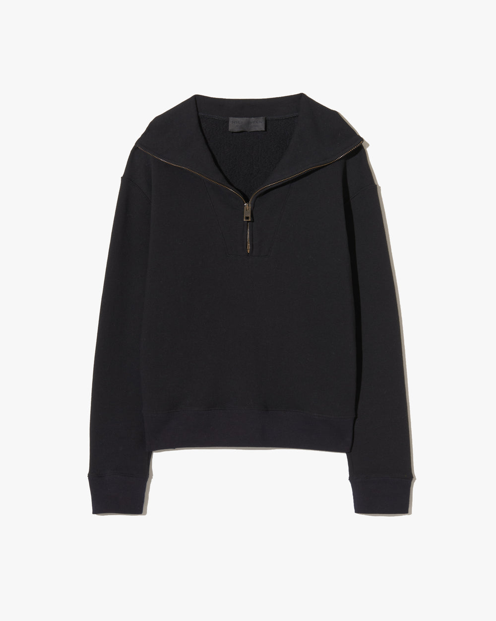 Easy fit sweatershirt. Double layer collar. 1/4 zip front. Logo zipper pull in antique brass. Rib trim at neckline, sleeves and hem.