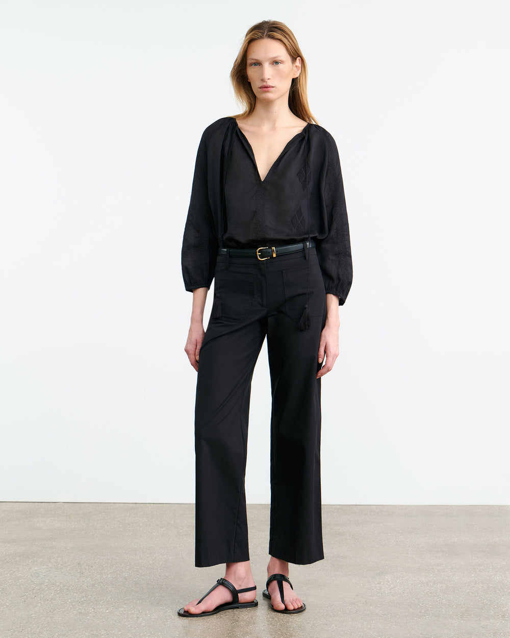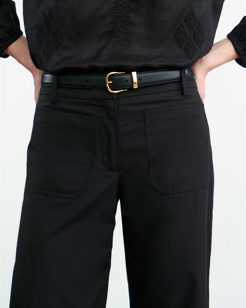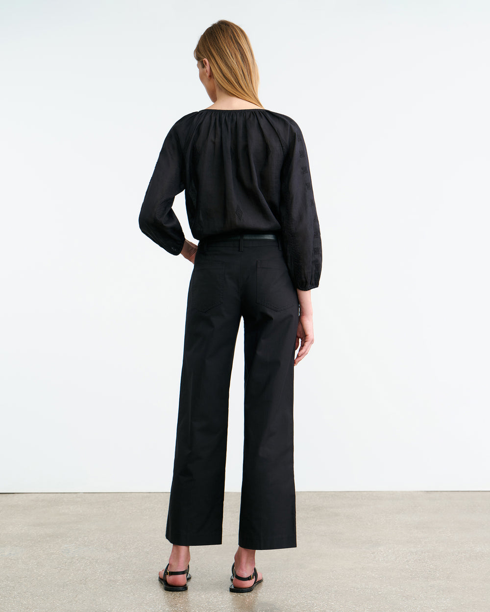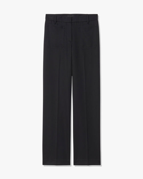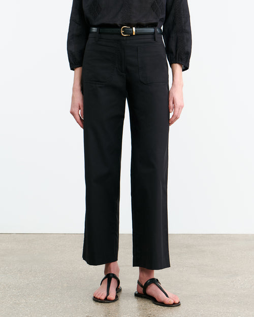 Flat front high waist straight leg pant in Japanese cotton cupro twill. Slight flare hem. Front and back patch pockets. Zip fly. Hook-and-bar closure.