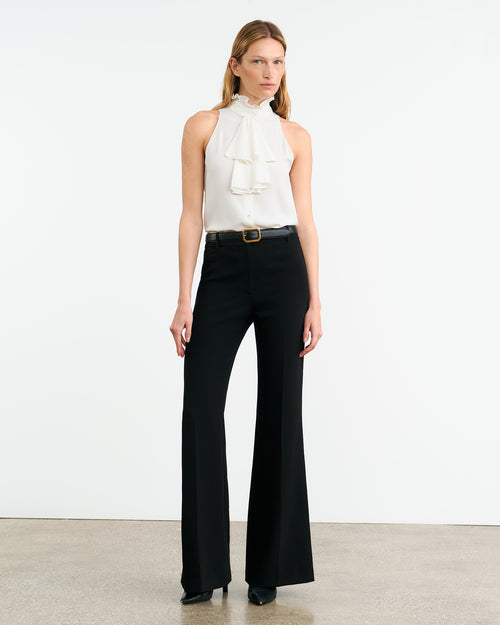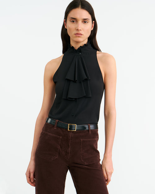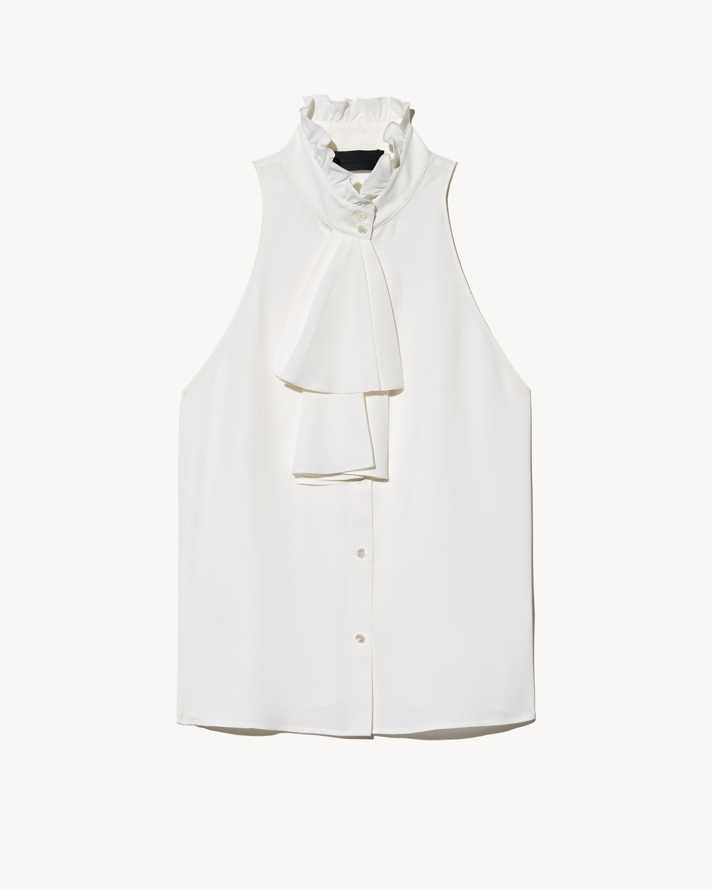 Sleeveless shirt. Center front button placket. Ruffle collar stand with attached scarf detail. Straight hem.