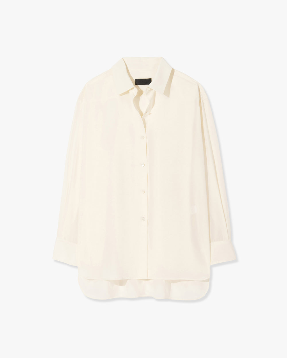 Oversized long-sleeved button-front shirt in fluid silk crepe de chine. Dropped shoulder. Spread collar. Shirred back yoke. Curved shirttail hem. Minimally styled with clean front and tonal buttons.