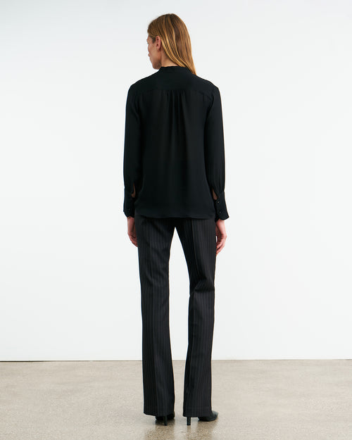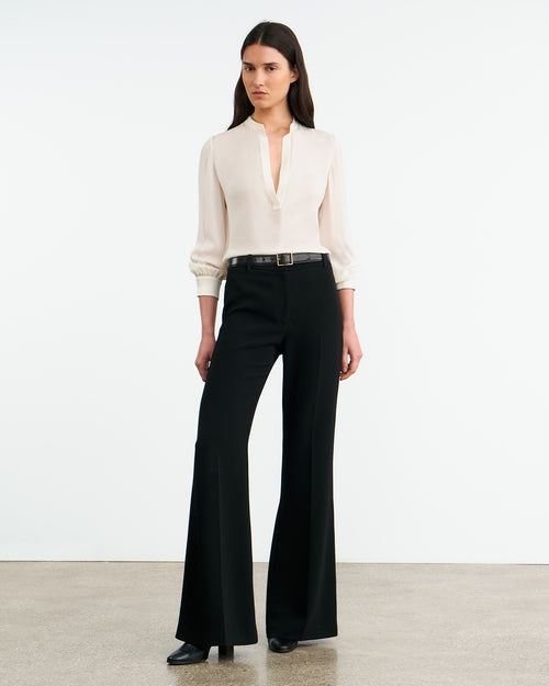Easy pullover blouse. Collar stand and low open neckline. Shirring detail at front and back. Button cuffs. Back yoke with center shirring. Straight front hem. Curved back hem.