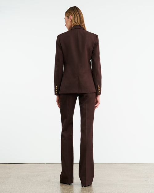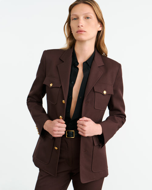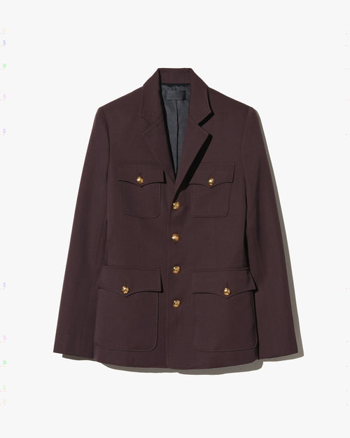 Slim, straight lapel jacket. Soft structured shoulder pads. Chest flap patch pockets. Flap patch pockets. Signature crest buttons in antique brass at front and sleeve. Seaming details for shape. Interior chest pocket. Back vent. Fully lined.