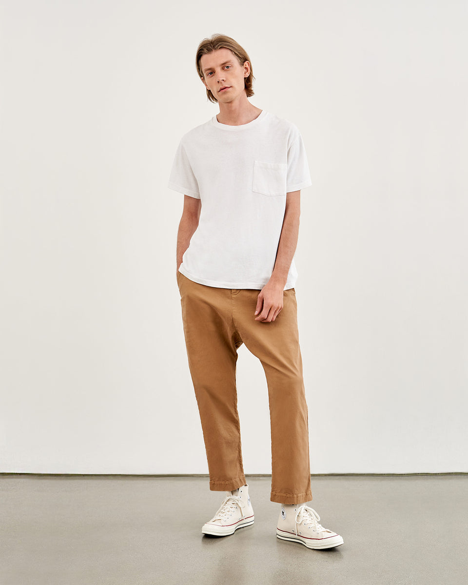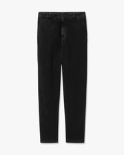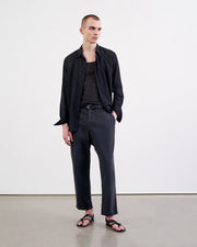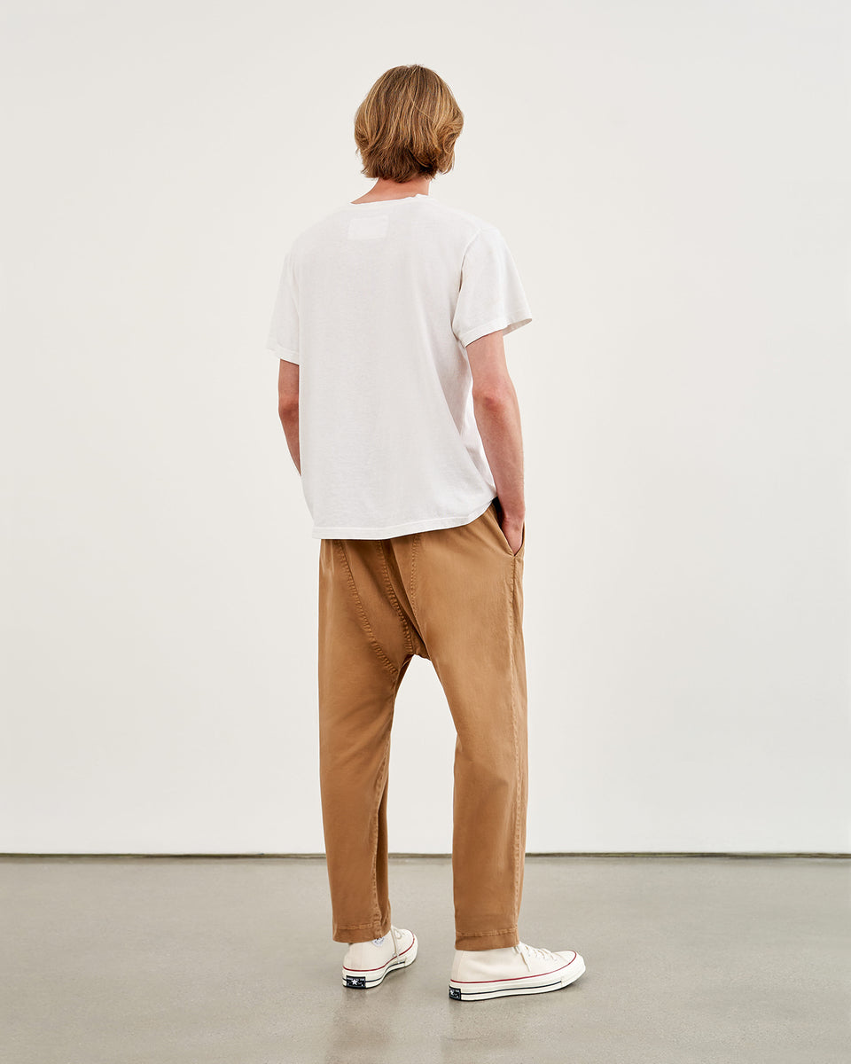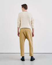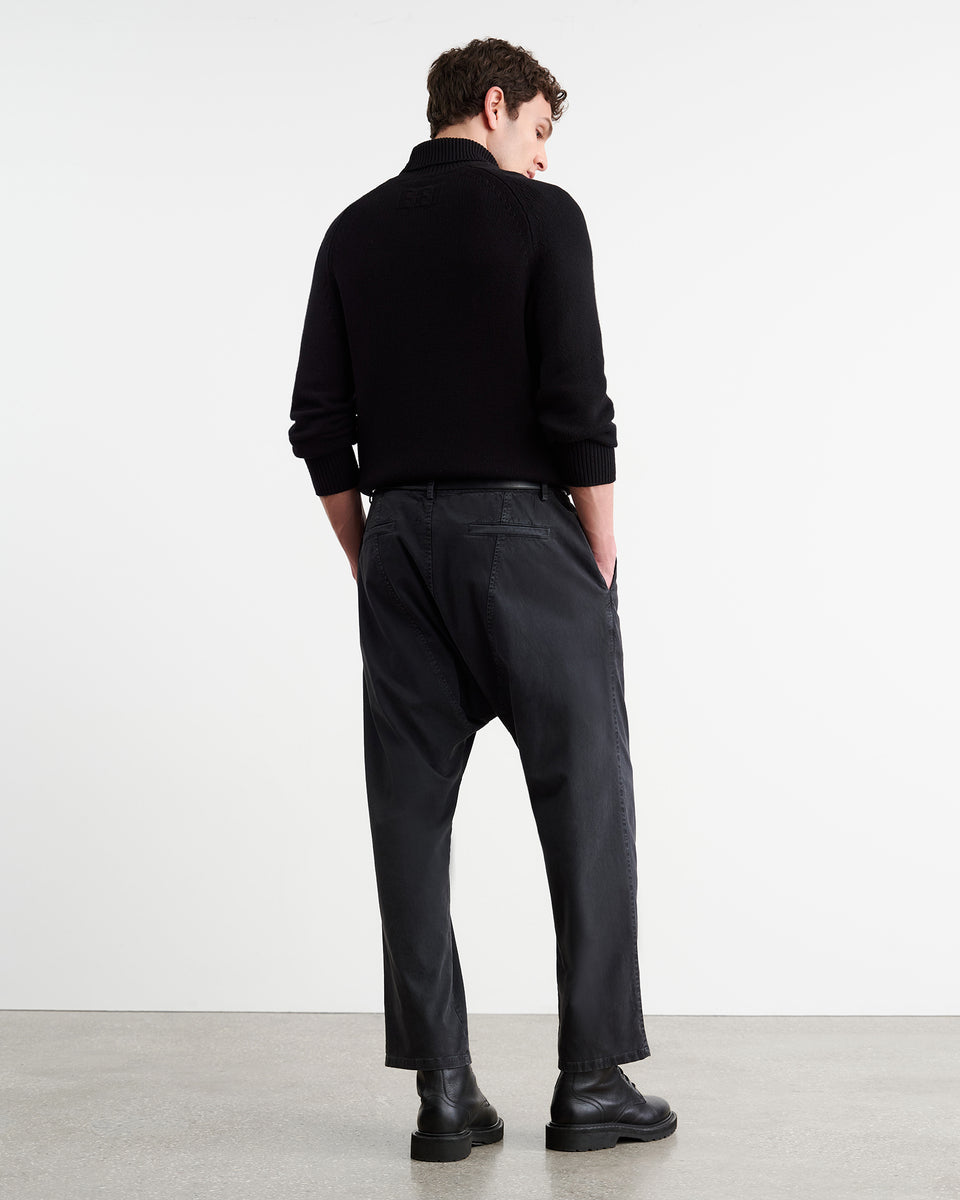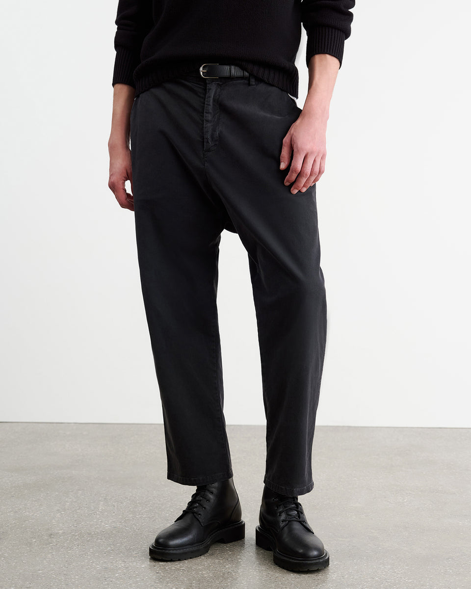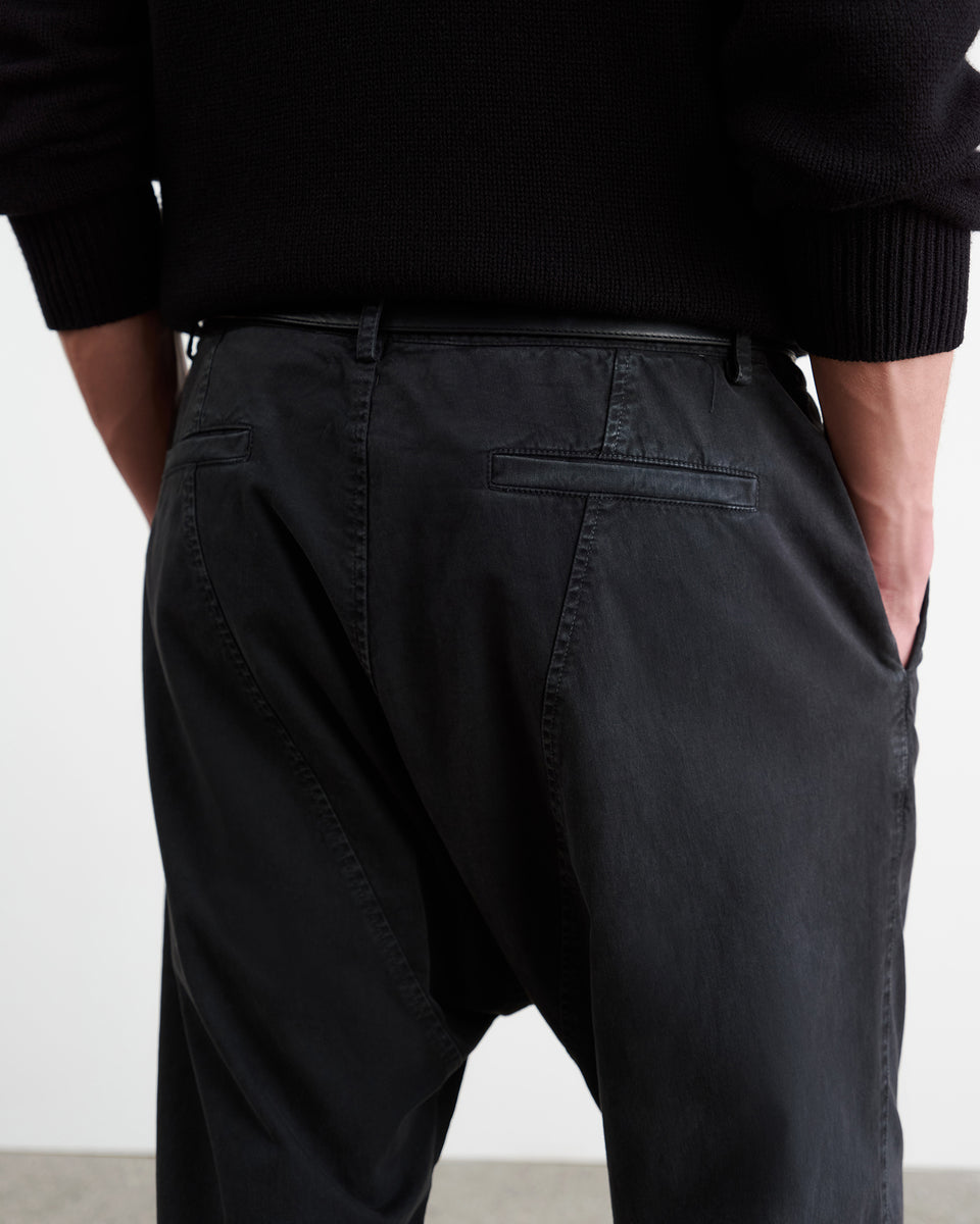 Mid-rise relaxed drop crotch pant. Tapers from knee. Cropped above ankle. Zip front with hook and bar closure. Front slash pockets and back flap pockets. Seaming detail in back.
