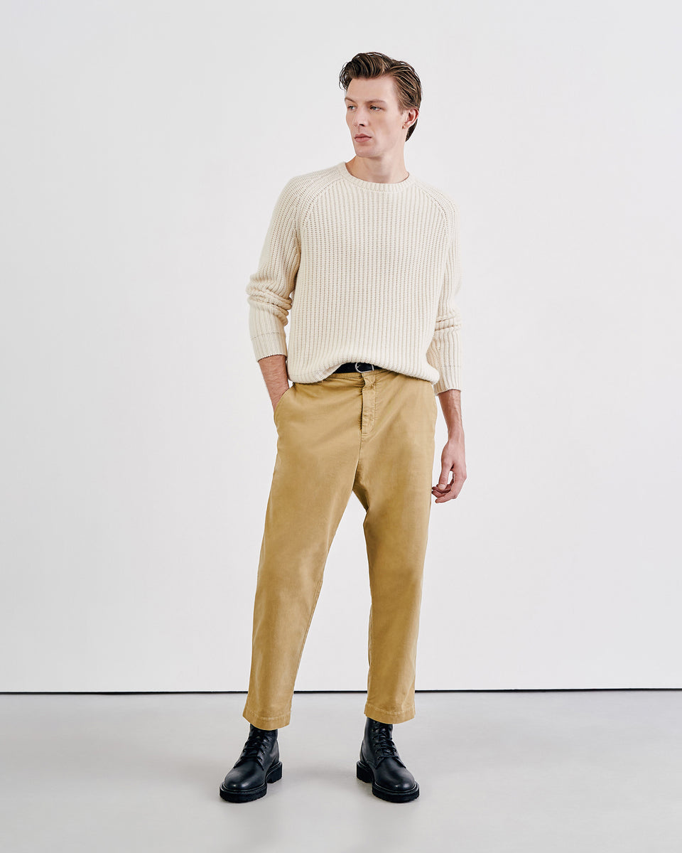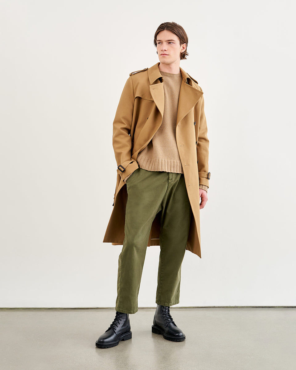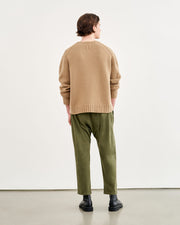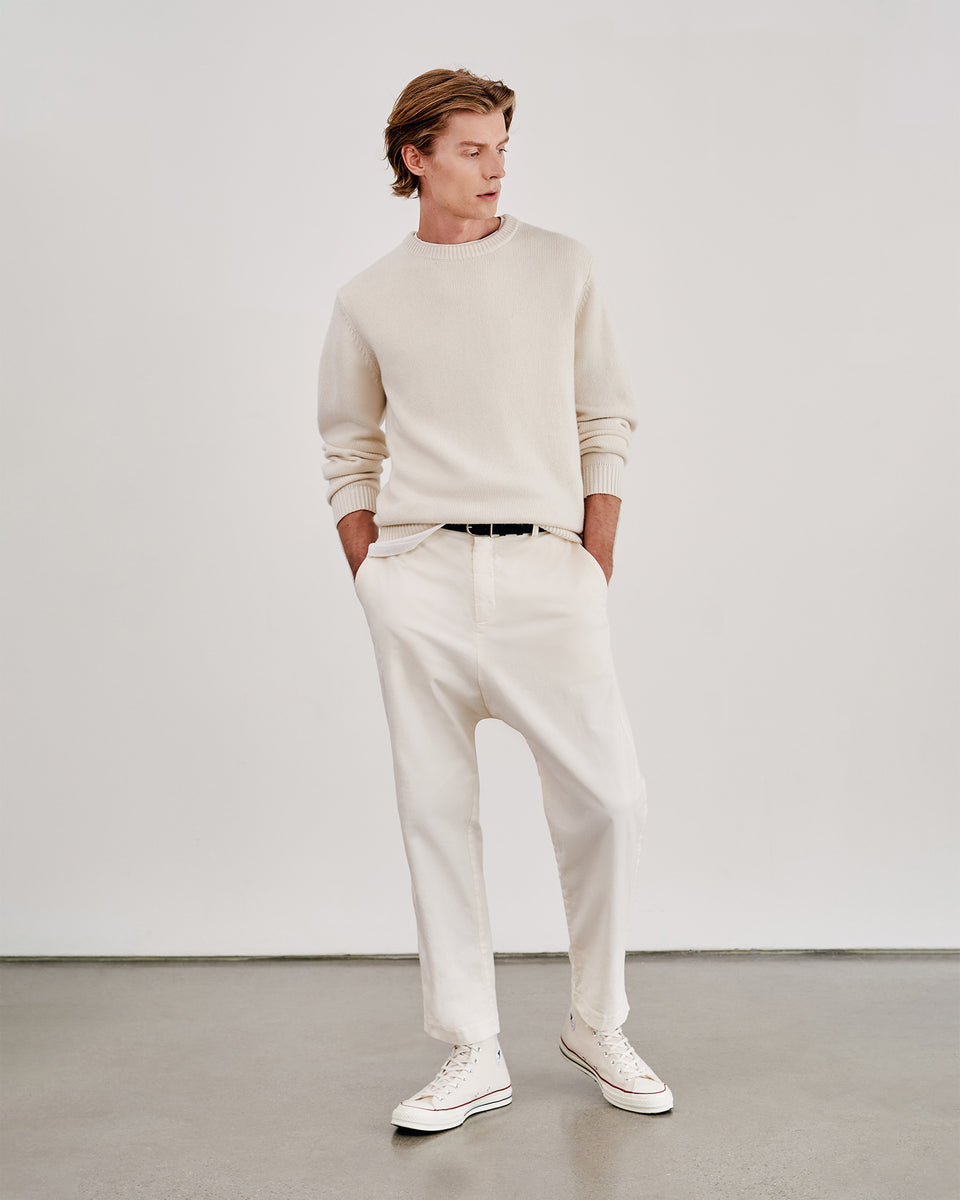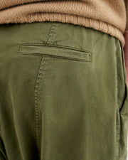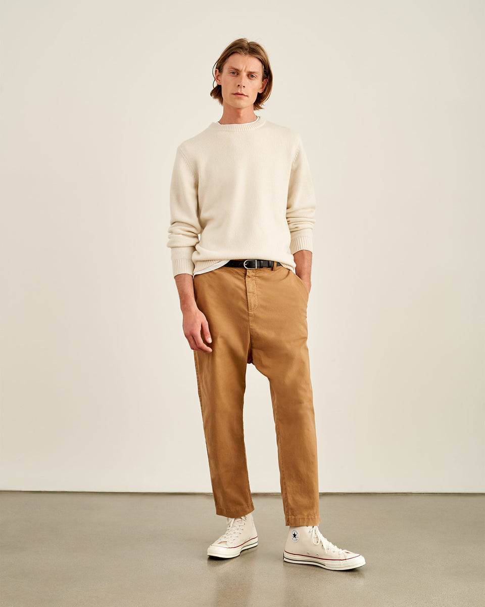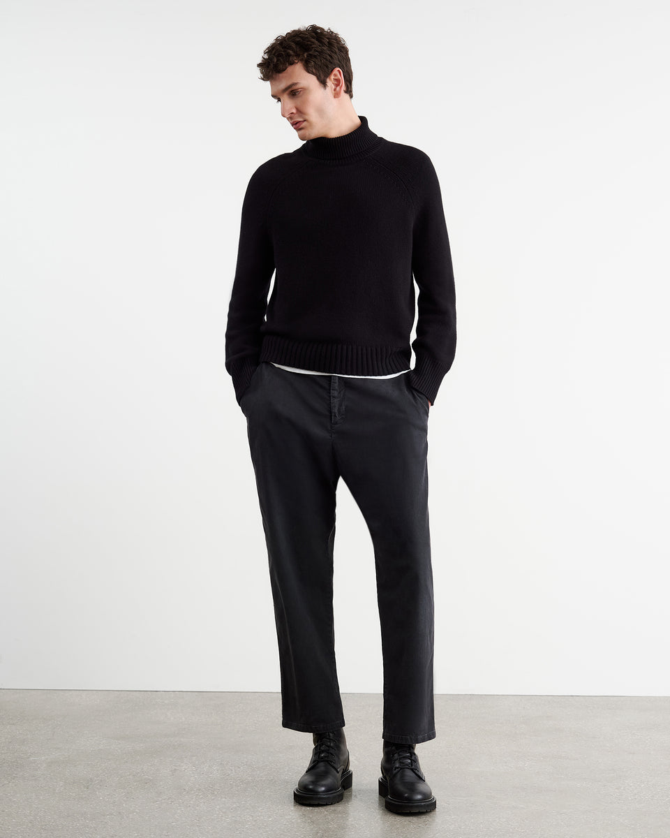 Mid-rise relaxed drop crotch pant. Tapers from knee. Cropped above ankle. Zip front with hook and bar closure. Front slash pockets and back flap pockets. Seaming detail in back.
