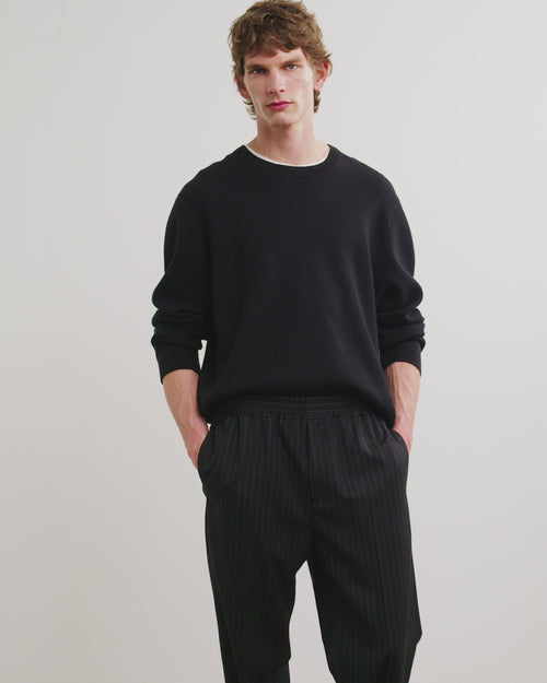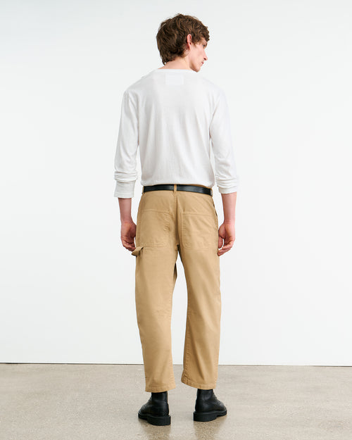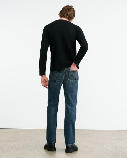 Relaxed fit long sleeve crew neck tee. Standard collar. Vintage pitch sleeve.